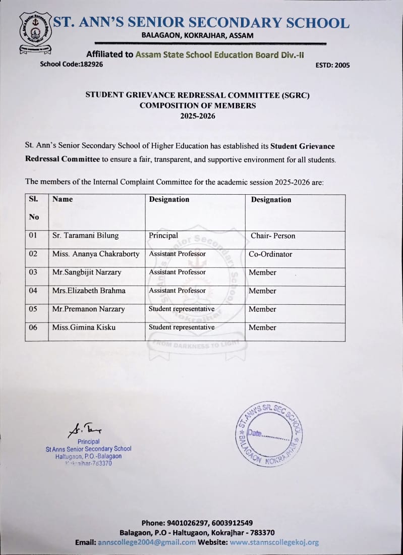The Students’ Grievance Redressal Committee (SGRC) of St. Ann’s Senior Secondary School, Kokrajhar, functions as a pivotal institutional body committed to safeguarding student rights and ensuring procedural justice within the academic framework. Through its structured functioning, the SGRC reinforces the institution’s ethos of accountability, transparency, and responsiveness, thereby strengthening a student-centric governance model that provides a formalized, confidential, and equitable mechanism for addressing grievances. The school offers multiple channels, including written submissions and digital platforms to ensure easy and inclusive access to the grievance redressal mechanism within a defined timeframe that facilitates prompt action and minimize distress among students.